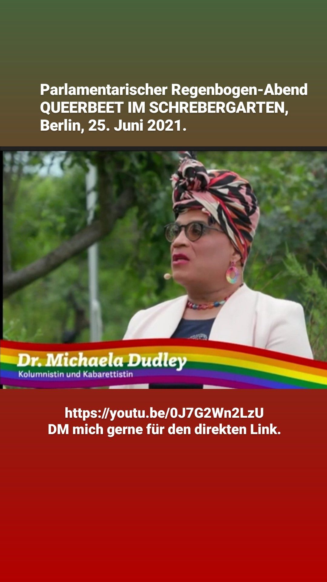 Dr. Michaela Dudley Dank Ulle Schauws, MdB und Fraktionssprecherin für Queerpolitik bei Bündnis 90/Die Grünen, wurde meiner Wenigkeit die Ehre zuteil, beim Parlamentarischen Regenbogenabend als Talkgästin aufzutreten: zwischen Anton Hofreiter, Claudia Roth, Rachel Levine (trans* Frau und Staatssekretärin im US-Gesundheitsministerium) und anderen. Ab ca. Minute 44 im Live-Stream im untenstehenden Video sprach ich über die Thematik Transsexuellengesetz / Selbstbestimmungsgesetz und forderte die Gesellschaft insgesamt zu mehr Solidarität mit der LGBTQ-Community auf. Aufzeichnung: https://www.youtube.com/watch?v=0J7G2Wn2LzU Meine diesbezügliche Kolumne in der TAZ: https://taz.de/Regenbogen-versus-Reichkriegsflagge/!5782302/